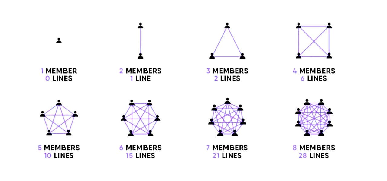 The physics of team size explains why small teams work so effectively. Communication pathways multiply exponentially as teams grow. A four-person team has just six unique communication paths. Double that to eight people, and you're dealing with 28 pathways. With ten people, it jumps to 45 pathways. This communication overhead creates friction that slows everything.